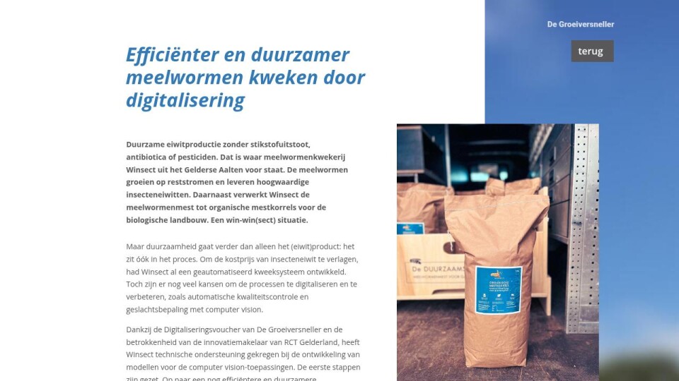 Dankzij de Digitaliseringsvoucher van De Groeiversneller en de betrokkenheid van de innovatiemakelaar van RCT Gelderland, heeft Winsect technische ondersteuning gekregen bij de ontwikkeling van modellen voor de computer vision-toepassingen. De eerste stappen zijn gezet. Op naar een nog efficiëntere en duurzamere meelwormenkweek.