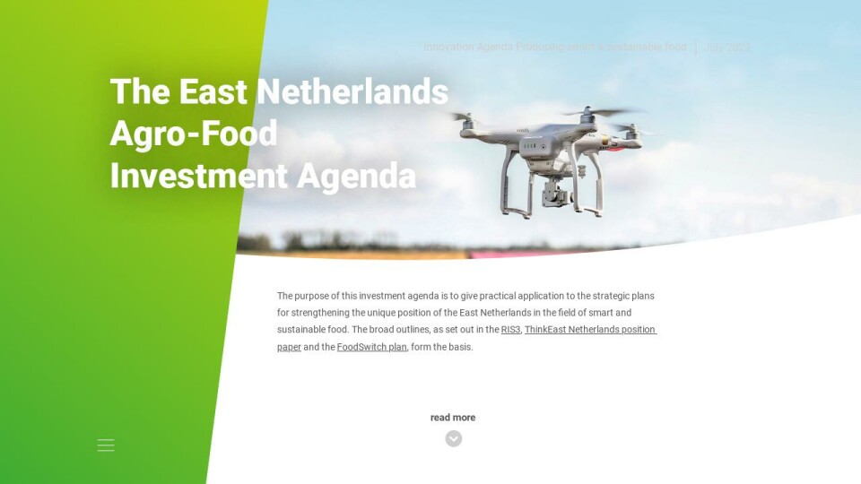 The purpose of this investment agenda is to give practical application to the strategic plans for strengthening the unique position of the East Netherlands in the field of smart and sustainable food. The broad outlines, as set out in the RIS3, ThinkEast Netherlands position paper and the FoodSwitch plan, form the basis.